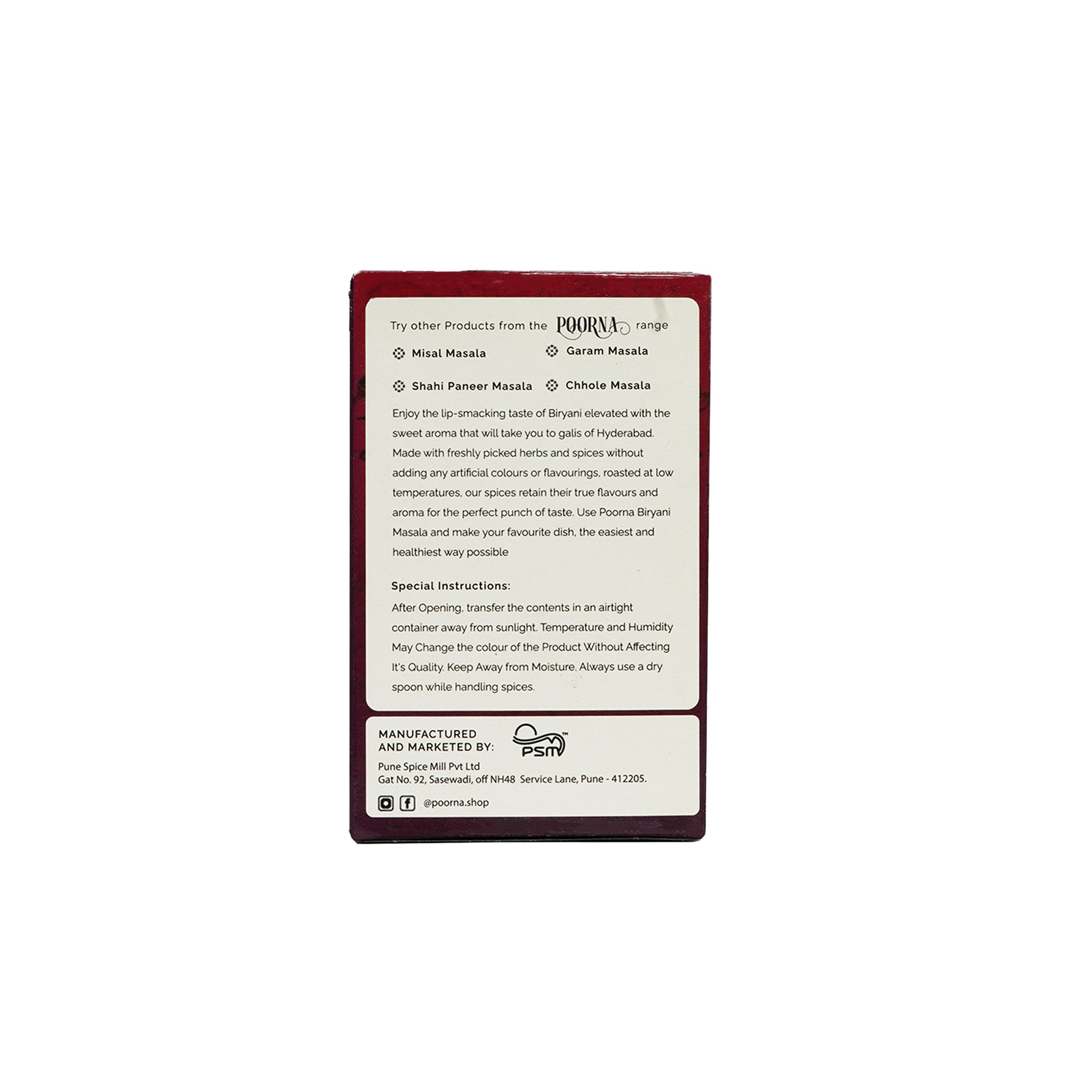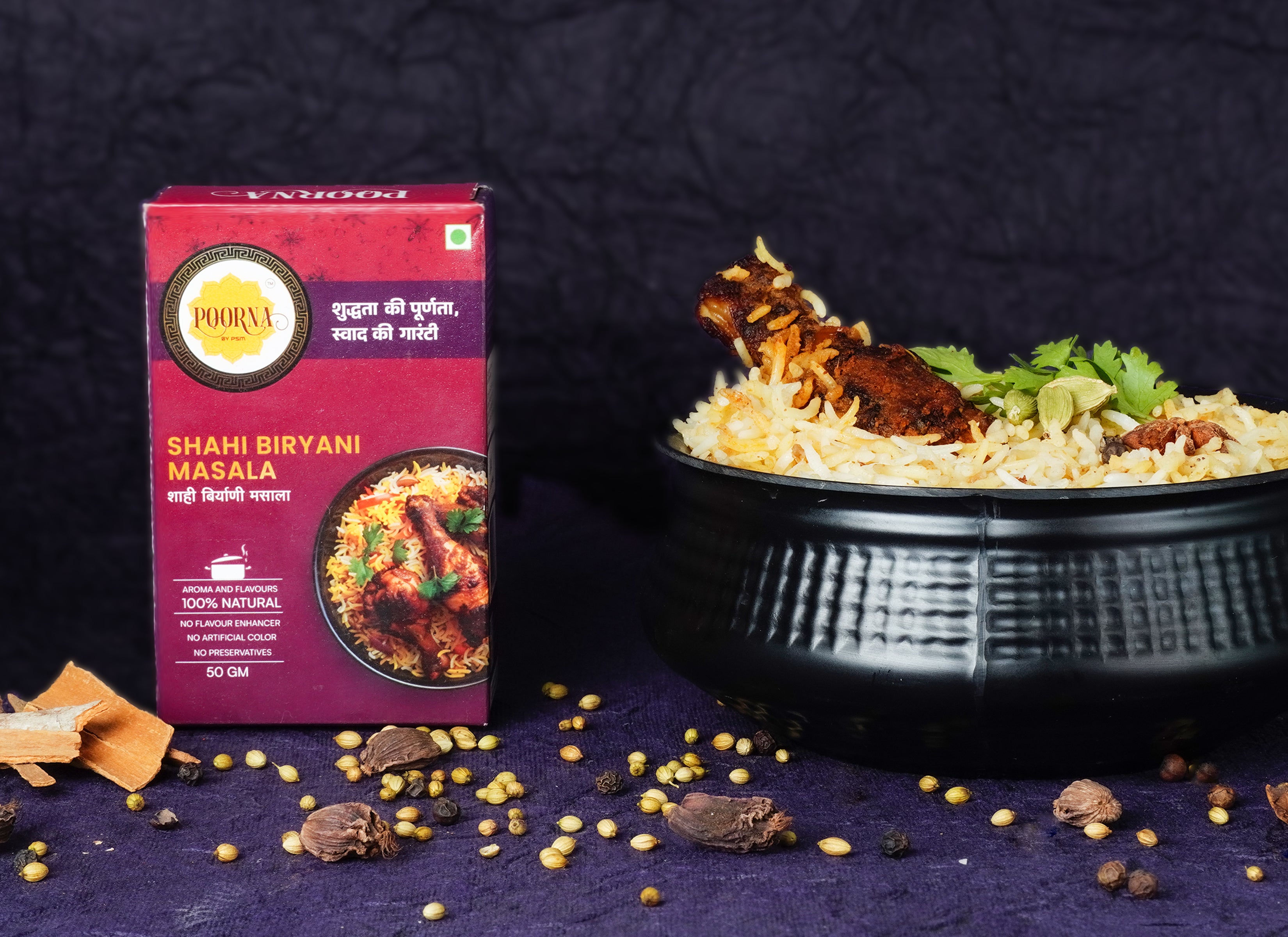 POORNA Biryani Masala is made using high-quality, handpicked ingredients that are sourced from the best spice markets in India. We take pride in using traditional low-temperature grinding techniques to make our masala, ensuring that every pack is filled with authentic flavour.