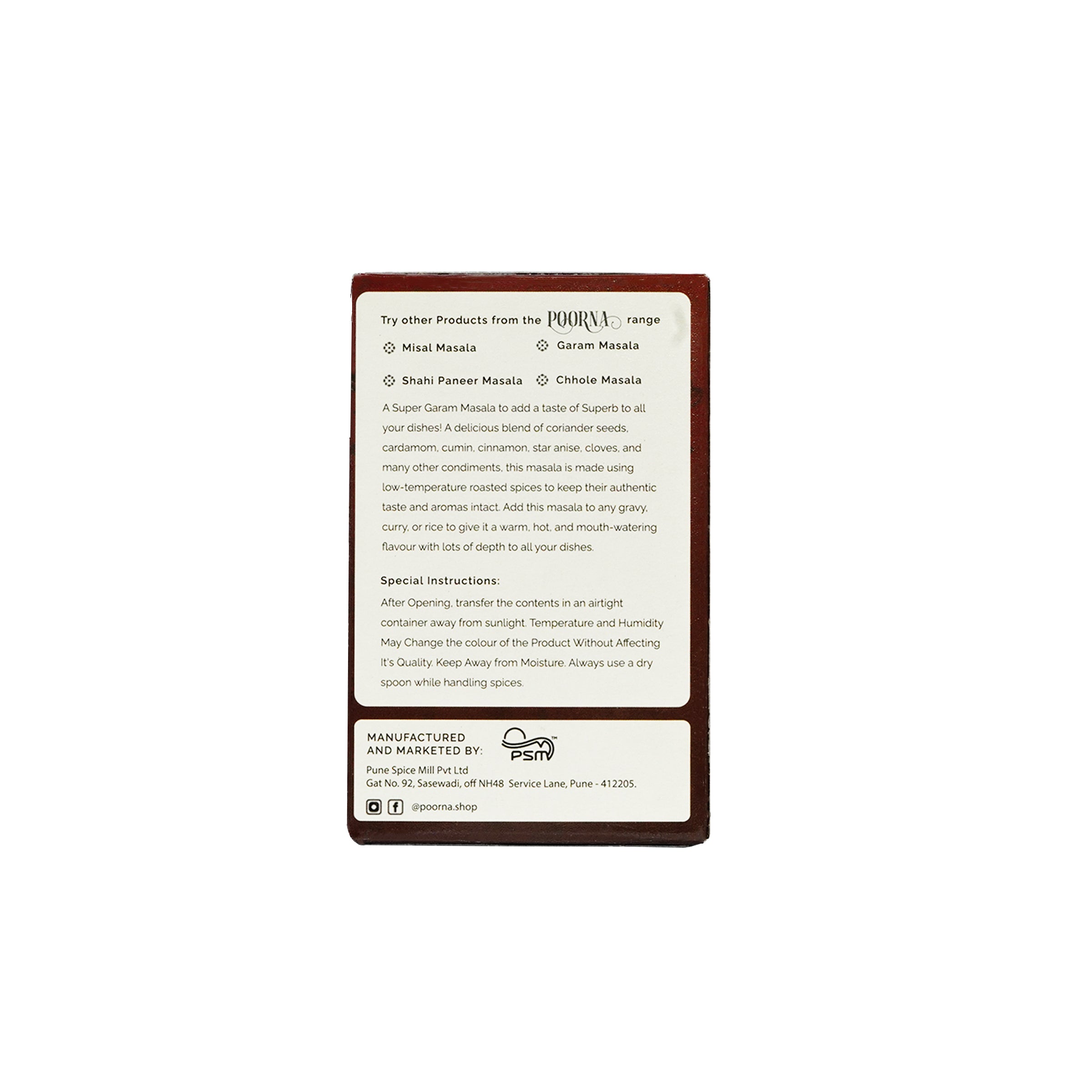 Whether you are making classic Indian dishes like biryanis, curries, or kebabs or experimenting with your versions, POORNA Super Garam Masala is the perfect seasoning to take your dish to the next level. It adds a royal touch to your food, making it fit for kings and queens.