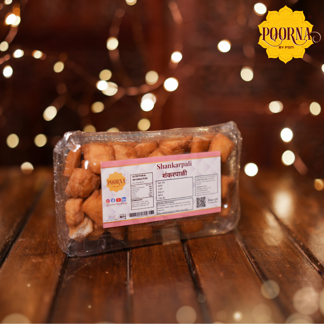 Shankarpali, also known as Shakkarpara in some regions, is one of the most loved festive snacks in Maharashtrian households. No Diwali faral is ever complete without a box of these golden, bite-sized delights that bring back memories of family gatherings, childhood, and festive warmth. At POORNA, we take pride in bringing you this traditional Diwali snack, handmade with care, authenticity, and the finest ingredients.